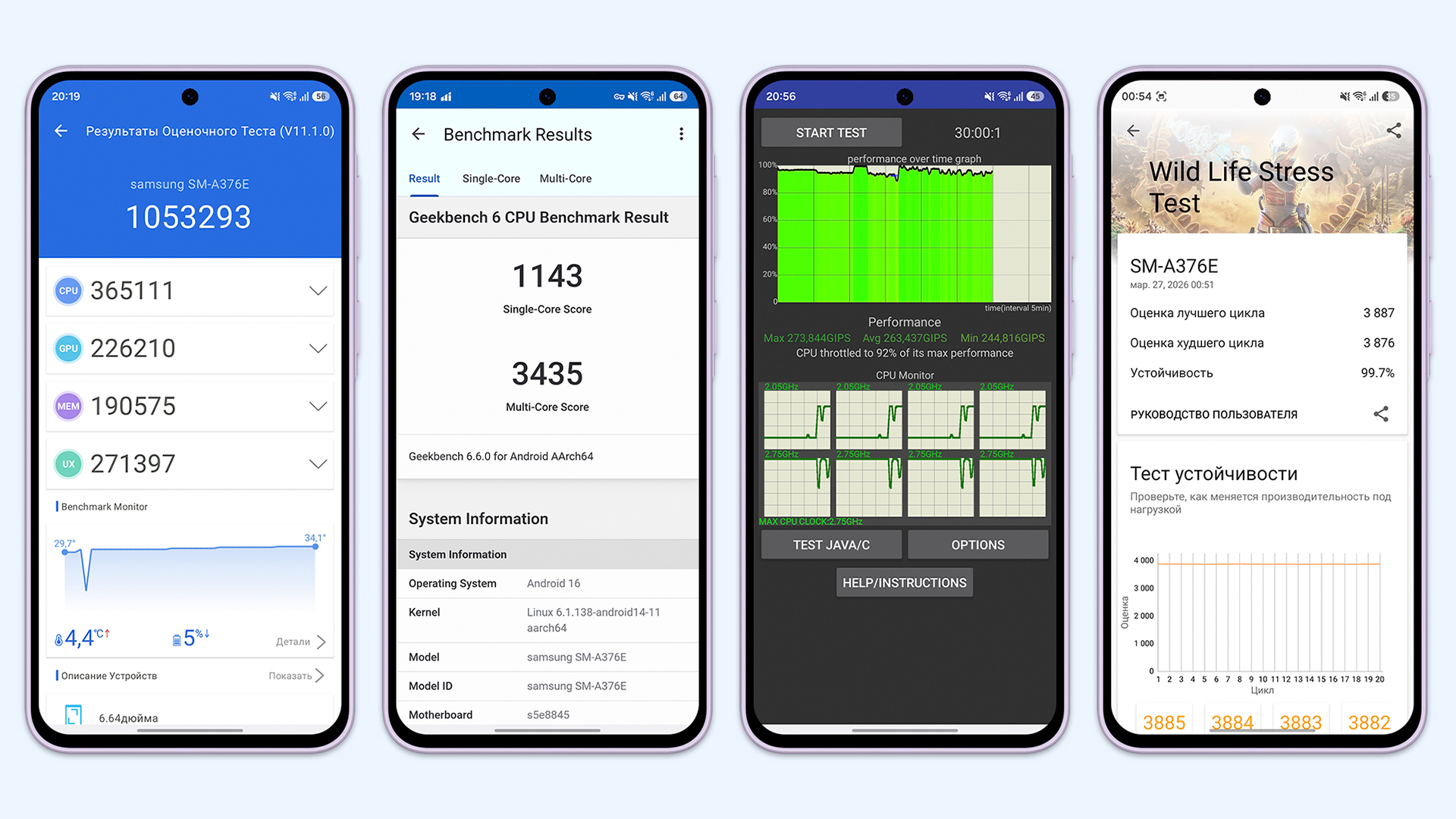 Главное отличие Galaxy A37 от предшественника кроется под капотом — смартфон получил обновленный фирменный процессор Exynos 1480. Работает он в паре с 6 или 8 ГБ оперативной памяти и встроенным накопителем на 128 или 256 ГБ. Пусть он и не бьёт рекорды в бенчмарках, этого железа с лихвой хватает для большинства мобильных задач.