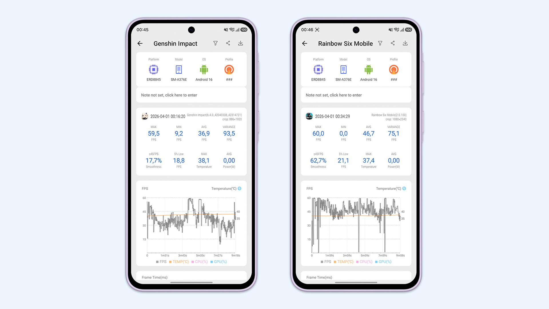 В играх аппарат показывает себя уверенно, как крепкий середняк. В требовательную Genshin Impact можно играть на максимальных настройках графики в 37 FPS с просадками до 20 кадров, но лучше на средних настройках — так можно получить комфортные 50–60 FPS. В проектах попроще, вроде Rainbow Six Mobile, смартфон выдает около 47 кадров в среднем. При этом с нагревом всё отлично: за 20 минут смартфон становится просто тёплым.